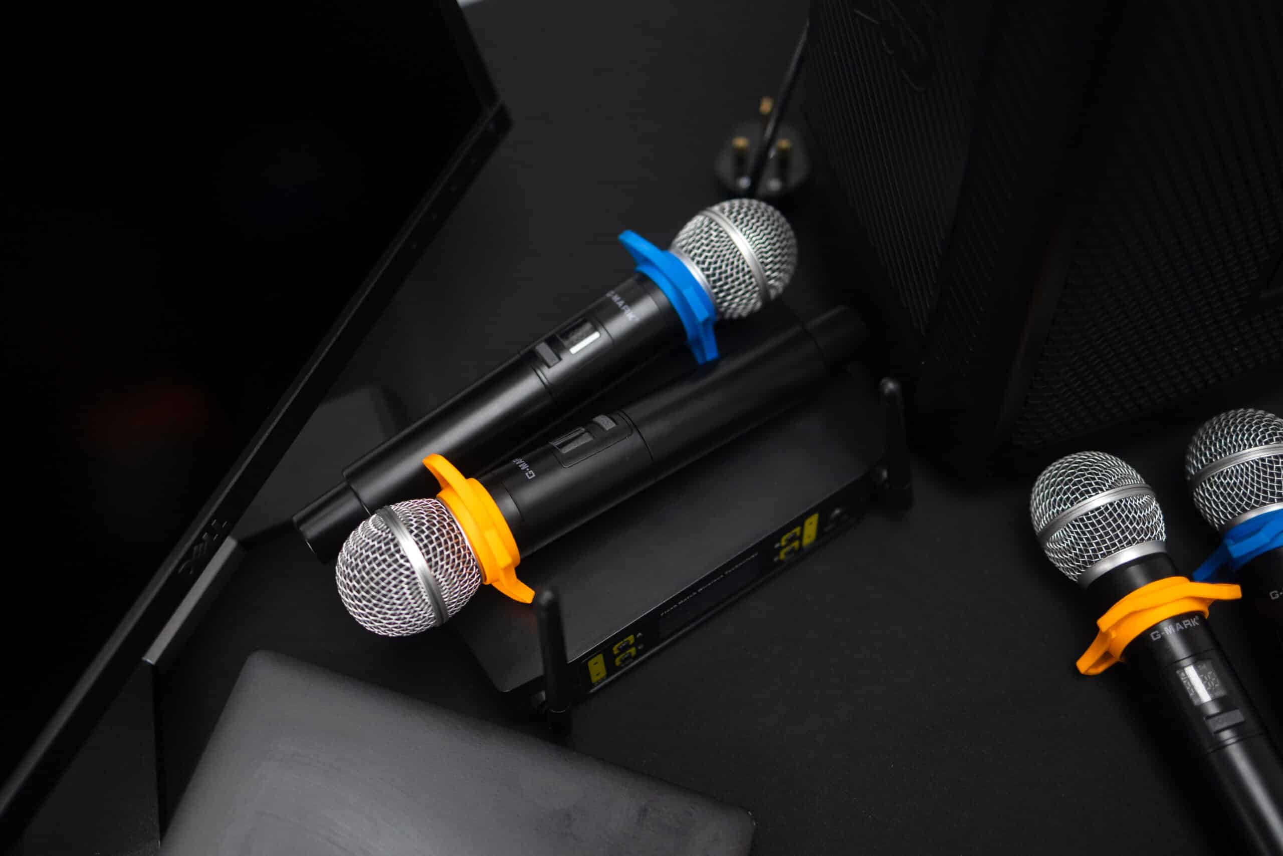 - Four wireless microphones